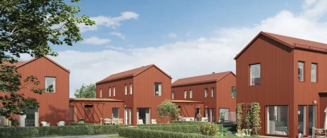I småstadsidyllen Fjärås Bygger Derome Bostad AB 14 st kedjehus med frånluftsvärmepumpar. Alig levererar.